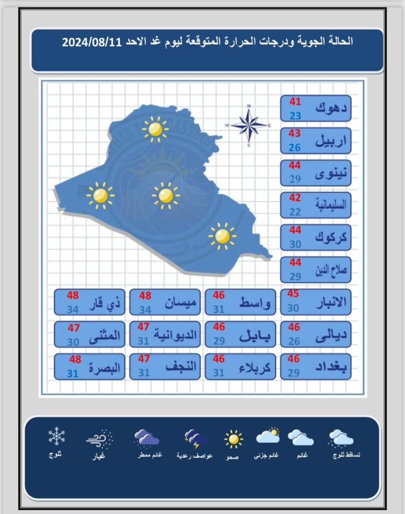 وأضافت ان “درجات الحرارة ستسجل يوم غد الأحد في ميسان والبصرة وذي قار 48 درجة مئوية وفي الديوانية والمثنى والنجف 47 مئوية، كما انها ستسجل في دهوك التي تعتبر هي الأقل قياسا بباقي المحافظات 41 مئوية وفي السليمانية 42 مئوية وفي أربيل 43 مئوية”، لافتة الى ان “بغداد ستسجل حرارة تصل الى 46 مئوية”