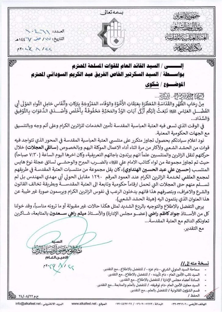 قدمت العتبة العباسية، ، شكوى الى رئيس الوزراء ضد الاعتداءات المتكررة لمنتسبي هيئة الحشد الشعبي ضد عجلات ومنتسبي العتبة.