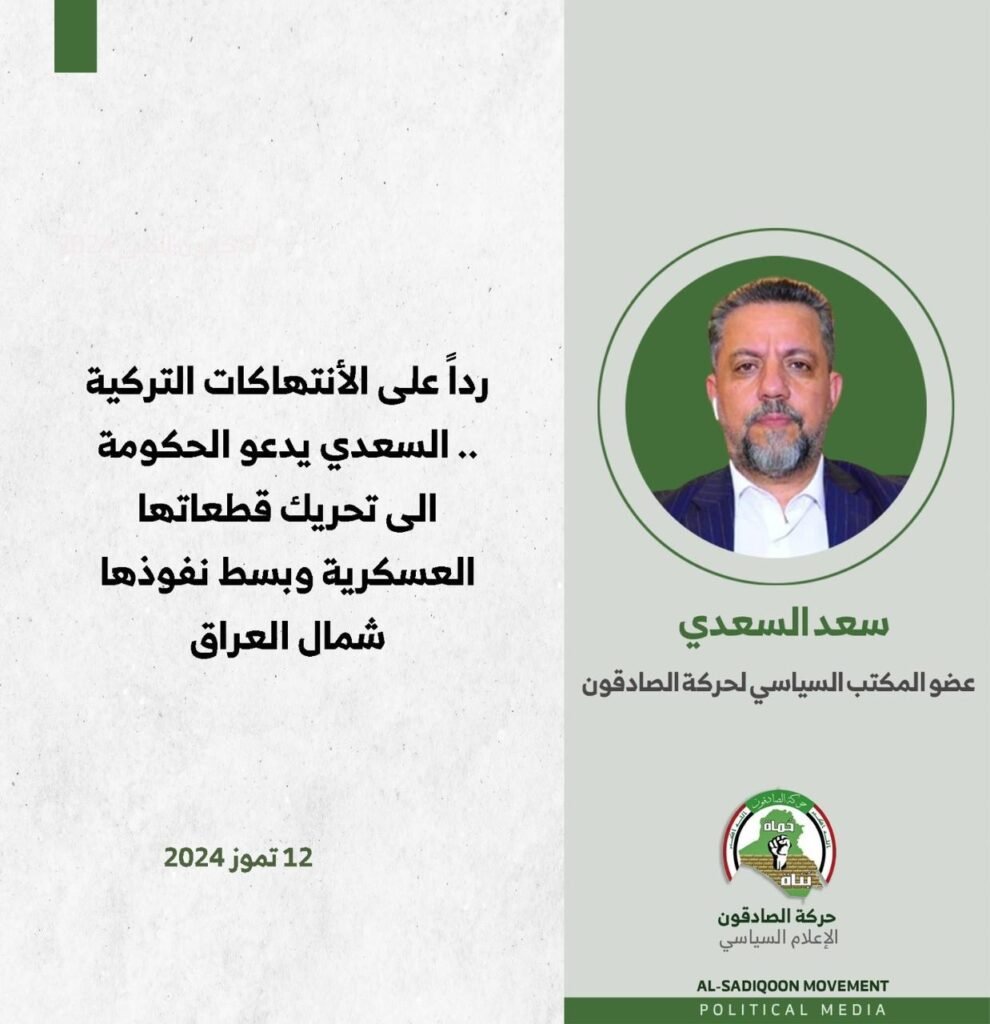 و قال السعدي خلال حديث متلفز ، ان انتهاكات الجيش التركي في شمال العراق سابقة خطيرة و يجب اتخاذ موقف حكومي ضدها، مبينا ان تلك الأنتهاكات تستدعي وقفة جادة لاسيما مع وجود تواطؤ داخلي وخارجي مع انقرة .