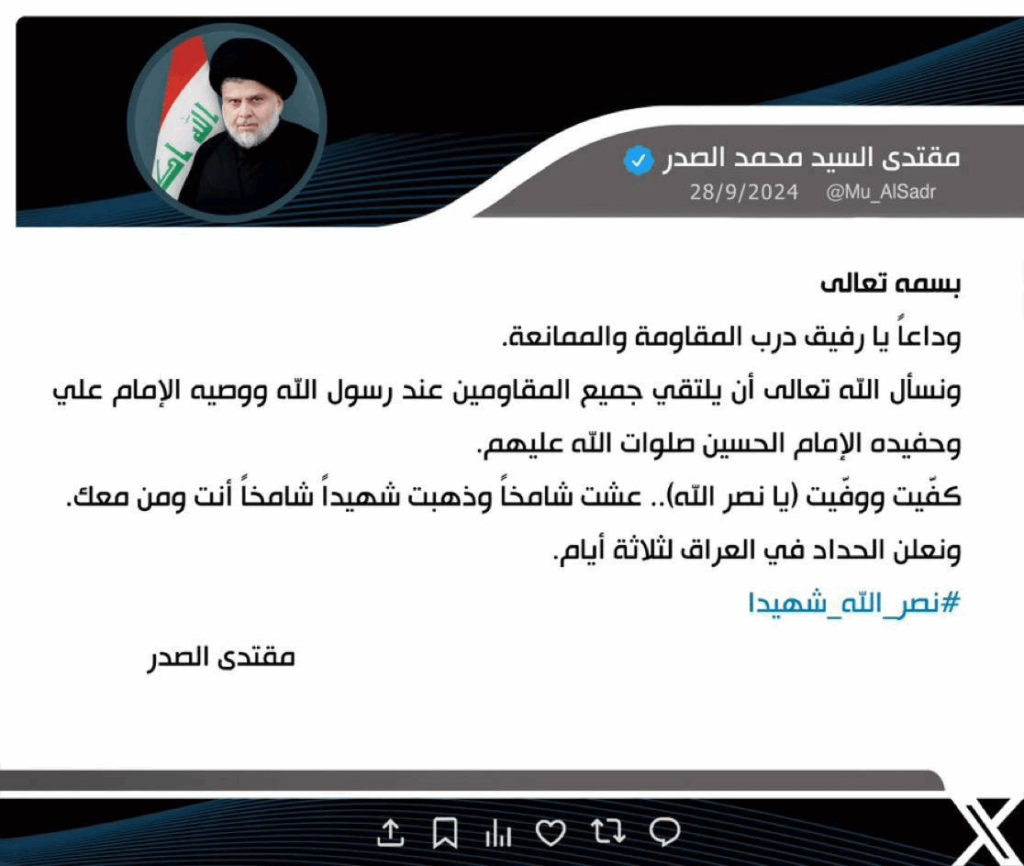وقال السيد الصدر في تغريدة وردت لكربلاء 24، “وداعاً يا رفيق درب المقاومة والممانعة. ونسأل الله تعالى أن يلتقي جميع المقاومين عند رسولالله ووصيه الإمام علي وحفيده الإمام الحسين صلوات الله عليهم. كفيت ووفيت (يا نصر الله).. عشت شامخاً وذهبت شهيداً شامخاً أنت ومن معك”.