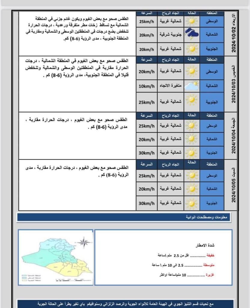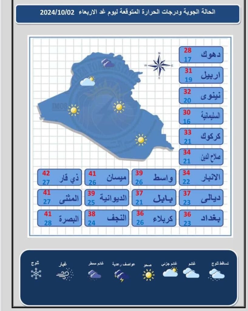 وتابعت ان “اعلى درجات حرارة ستسجل يوم غد الاربعاء، في ذي قار بمعدل 42 مئوية تليها المثنى والبصرة وميسان بواقع 41 مئوية، فيما ستسجل بغداد 36 مئوية”.