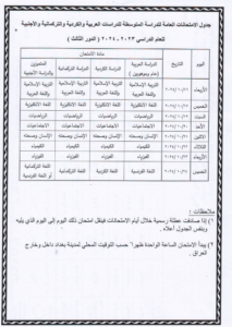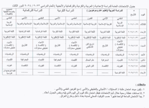 اعلنت وزارة التربية، اليوم الاحد، جداول الامتحانات الوزارية (الدور الثالث) لطلبة الثالث المتوسط والسادس الاعدادي للعام الدراسي 2023-2024.