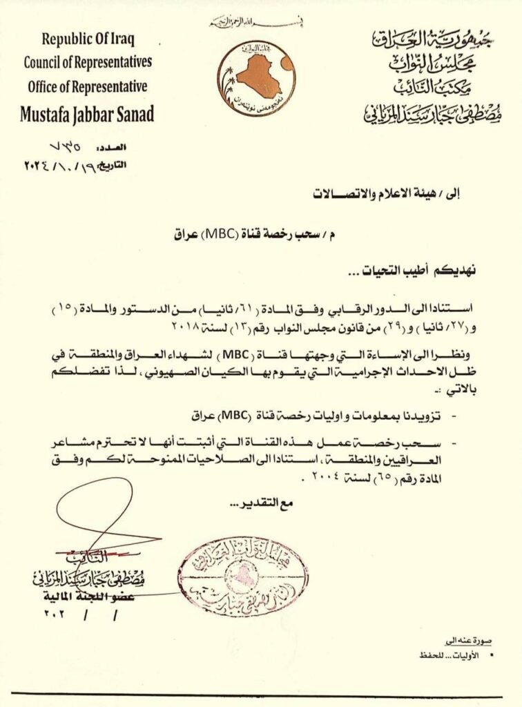 وقال سند في نص الكتاب الموجه إلى هيئة الإعلام والاتصالات، إنه “استنادا الى الدور الرقابي وفق المادة 61 / ثانيا من الدستور، والمادة 15 و 27/ثانياً و 29 من قانون مجلس النواب رقم 13 لسنة 2018 ، ونظرا الى الإساءة التي وجهتها قناة MBC لشهداء العراق والمنطقة في ظل الأحداث الإجرامية التي يقوم بها الكيان الصهيوني، لذا تفضلكم بالآتي:
