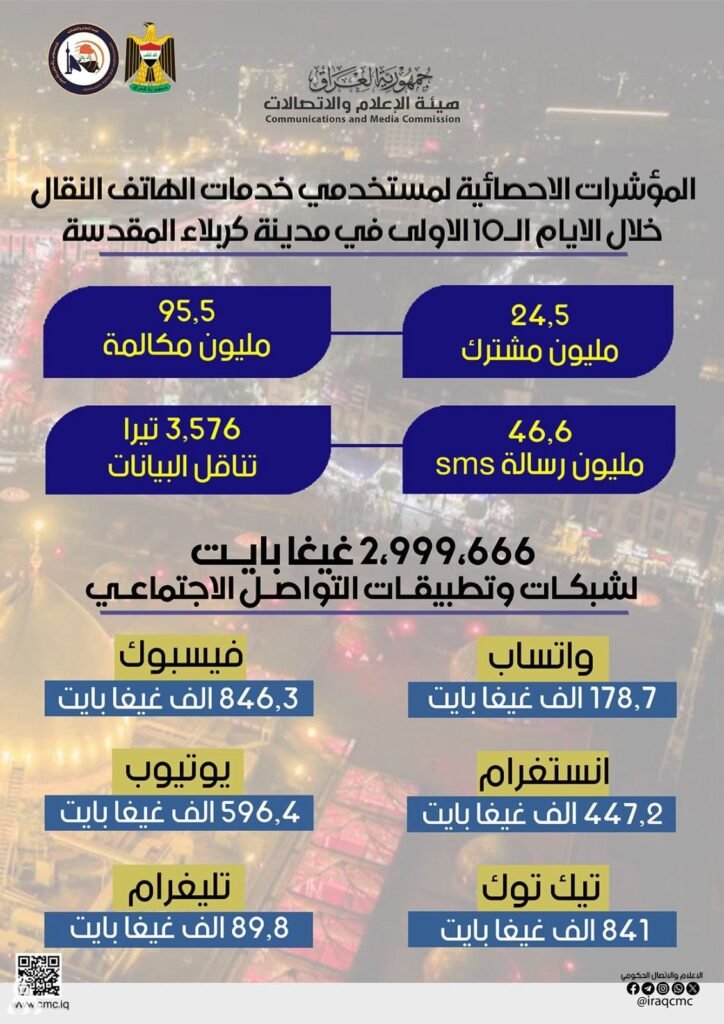 كما تشير هذه الأرقام إلى نجاح جهود هيئة الإعلام والاتصالات بالتعاون مع شركات الهاتف النقال العاملة في البلاد في تعزيز البنية التحتية لشبكات الاتصالات في كربلاء، وتوفير خدمات عالية الجودة للمستخدمين خلال هذه الفترة المزدحمة.