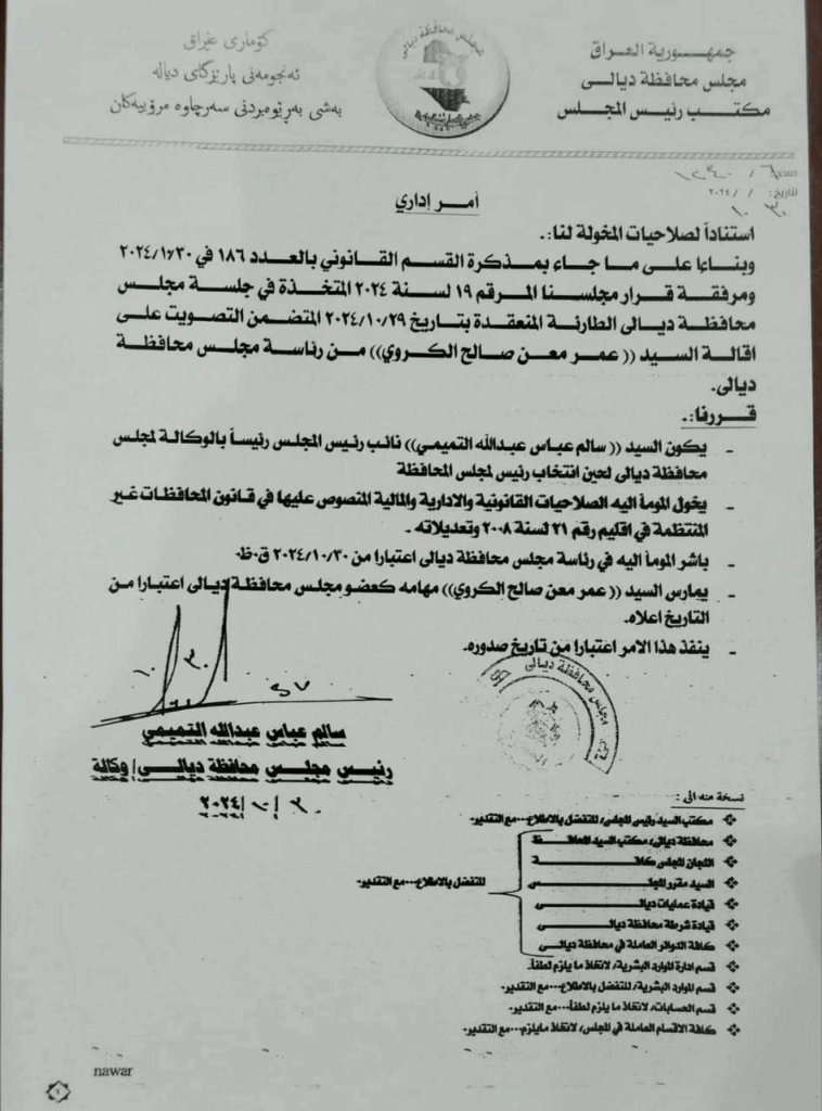 وبحسب وثيقة موقعة من رئيس مجلس محافظة ديالىبالوكالة سالم عبد الله التميمي، فان تم تعيين سالم عبد الله التميمي رئيساً لمجلس محافظة ديالى بالوكالة لحين انتخاب رئيس جديد، كما ان التميمي مخول بالصلاحيات القانونية والإدارية والمالية المنصوص عليها في قانون المحافظات غير المنتظمة في إقليم.