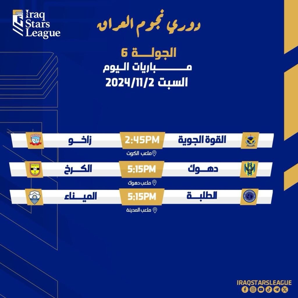 تقام اليوم السبت 1 تشرين الثاني 2024، 3 مباريات في ملاعب بغداد والكوت ودهوك لحساب الجولة السادسة من دوري النجوم للموسم الحالي.