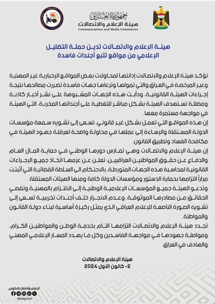 كم جددت هيئة الإعلام والاتصالات التزامها التام بخدمة الوطن والمواطنين الكرام، ومواصلة جهودها في مواجهة الفاسدين وكل ما يهدد المسار الإعلامي المهني والهادف في العراق.