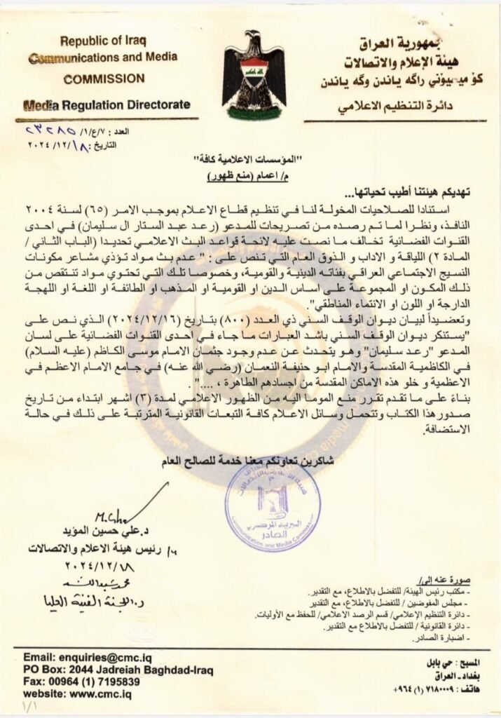 هيئة الإعلام والاتصالات تقرر منع ظهور رعد سليمان في كافة الوسائل الإعلامية العراقية