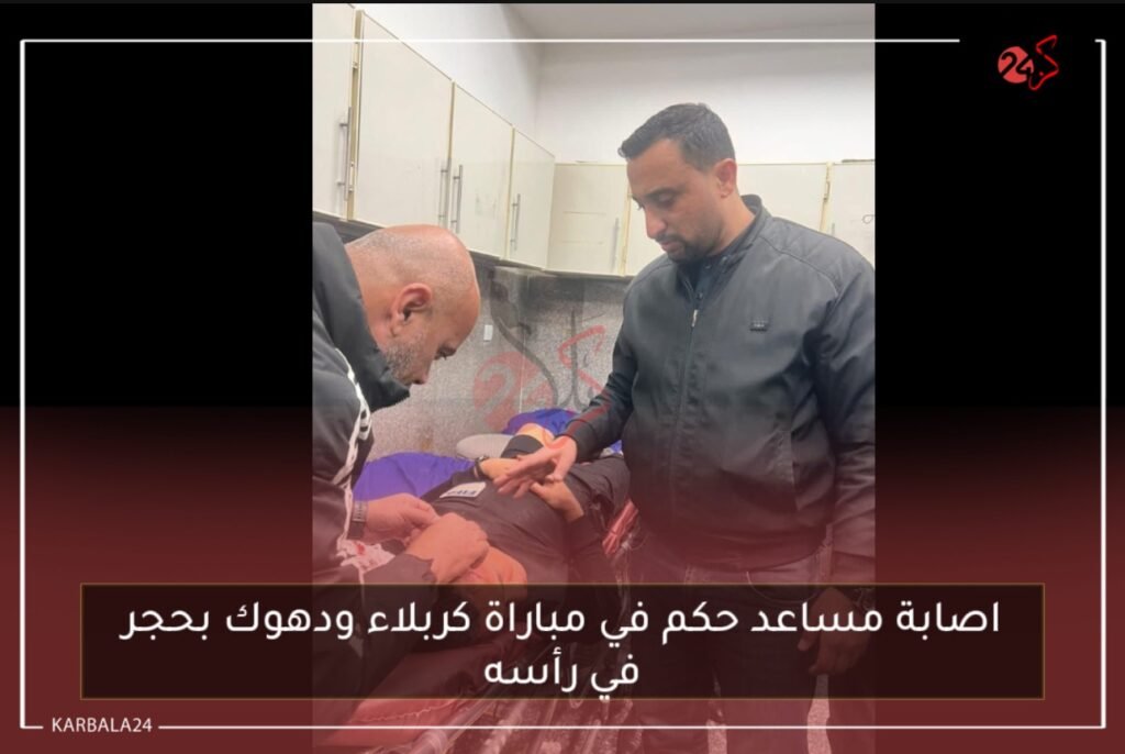 شهدت مباراة نادي كربلاء ونادي دهوك، التي أُقيمت على ملعب كربلاء الدولي، حادثة مؤسفة أدت إلى إنهاء اللقاء قبل صافرة النهاية. وتعرض الحكم المساعد حسين فلاح لإصابة مباشرة بحجر أُلقي من المدرجات، ما استدعى تدخلاً طبياً عاجلاً ونقله إلى المستشفى لتلقي العلاج.