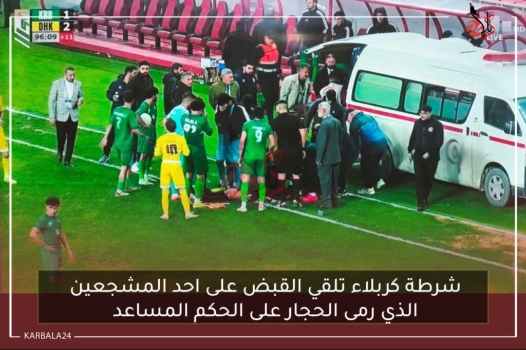 شرطة كربلاء تلقي القبض على احد المشجعين الذي رمى الحجار على الحكم المساعد