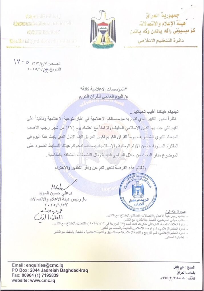 وجاء في بيان لهيئة الاعلام والاتصالات “ تلقت كربلاء 24 نسخة منه انه حث المؤسسات الاعلامية بتسليط الضوء على هذه المناسبة بأعتبار يوم 27 رجب ويصادف يوم المبعث النبوي الشريف هو اليوم الوطني للقرأن الكريم