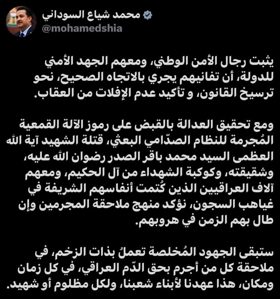 وختم السوداني: “ستبقى الجهود المُخلصة تعملُ بذات الزخم، في ملاحقة كل من أجرم بحق الدّم العراقي، في كل زمان ومكان، هذا عهدنا لأبناء شعبنا، ولكل مظلوم أو شهيد”