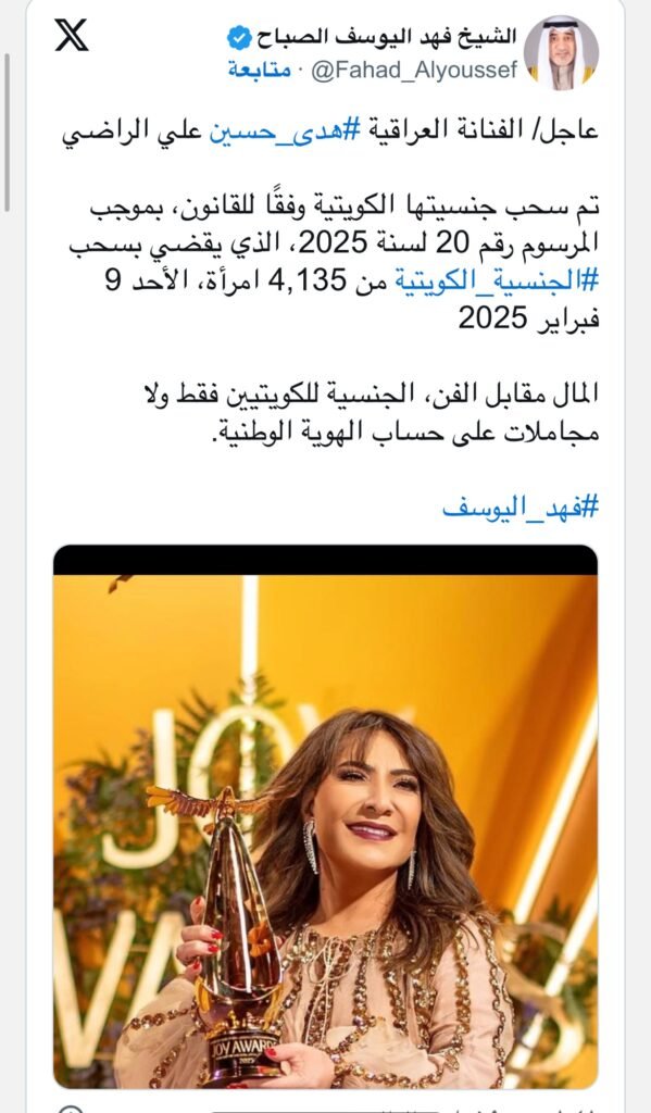 وكتب الوزير عبر حسابه على منصة “إكس”: الفنانة العراقية #هدى_حسين علي الراضي، تم سحب جنسيتها الكويتية وفقًا للقانون، بموجب المرسوم رقم 20 لسنة 2025، الذي يقضي بسحب #الجنسية_الكويتية من 4,135 امرأة، الأحد 9 فبراير 2025.