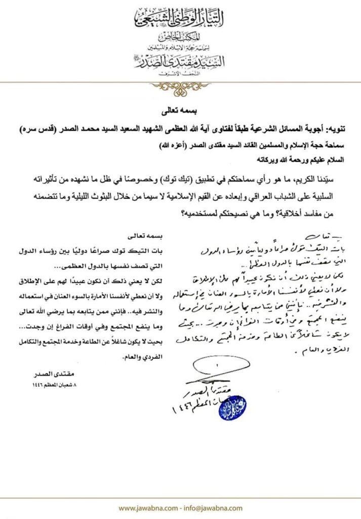وجاء في الوثيقة أن أحد الأشخاص سأل السيد الصدر “سيدنا الكريم، ما هو رأي سماحتكم في تطبيق (تيك توك) وخصوصا في ظل ما نشهده من تأثيراته السلبية على الشباب العراقي وإبعاده عن القيم الإسلامية لا سيما من خلال البثوث الليلية وما تتضمنه من مفاسد أخلاقية؟ وما هي نصيحتكم لمستخدميه؟