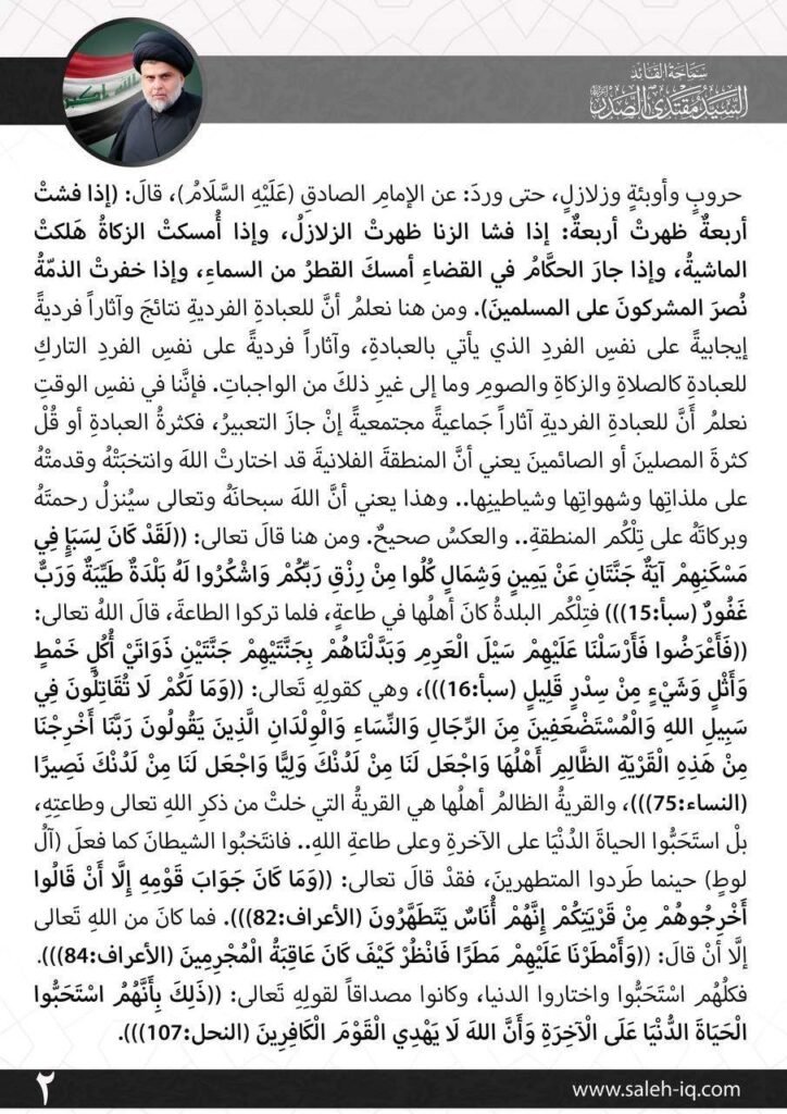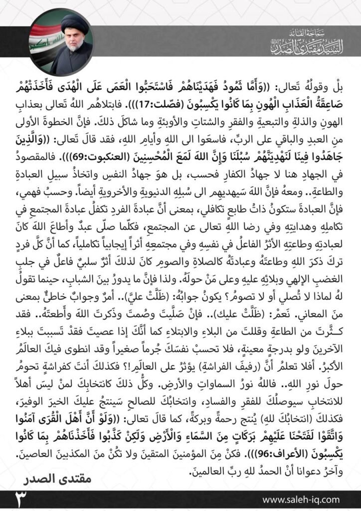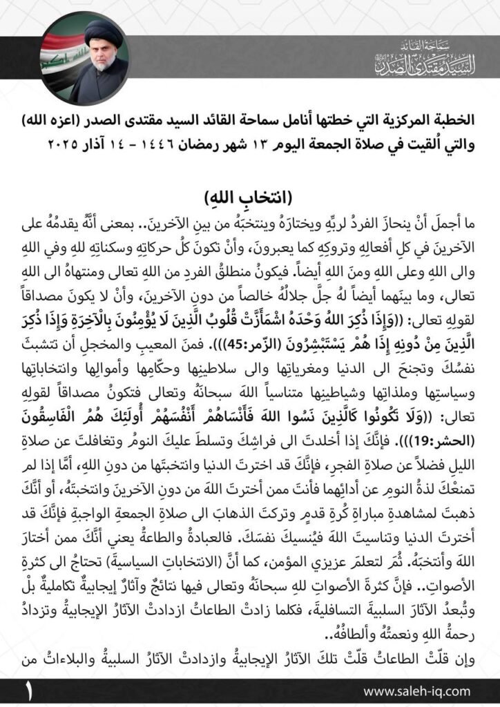 وأكد الصدر خلال خطبة الجمعة، أن “انتخابك لمن ليس أهلاً للانتخاب سيوصلُك للفقرِ والفسادِ وانتخابُك للصالح سَينتجُ عليك الخير الوفير”.