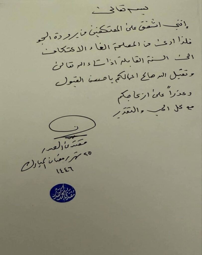 قرر زعيم التيار الوطني الشيعي السيد مقتدى الصدر، الغاء الاعتكاف في مسجد الكوفة بمحافظة النجف.