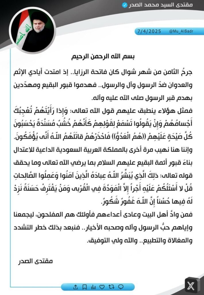 وقال السيد الصدر في تغريدة له على منصة “إكس”، “اننا نهيب بالمملكة العربية السعودية مرة أخرى للاعتدال ببناء قبور أئمة البقيع (عليهم السلام) بما يرضي الله”.