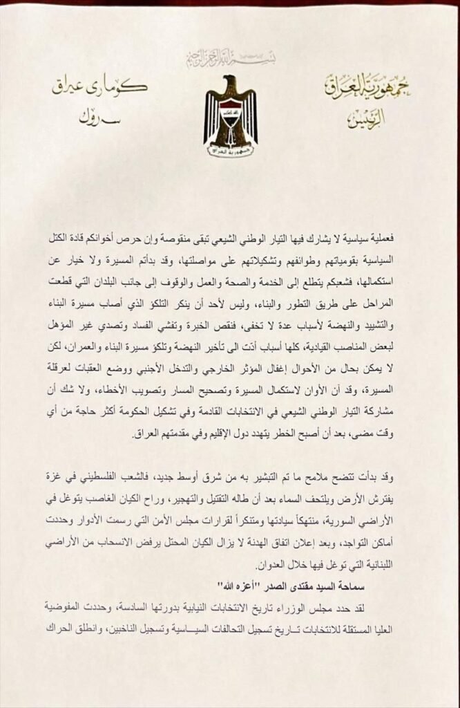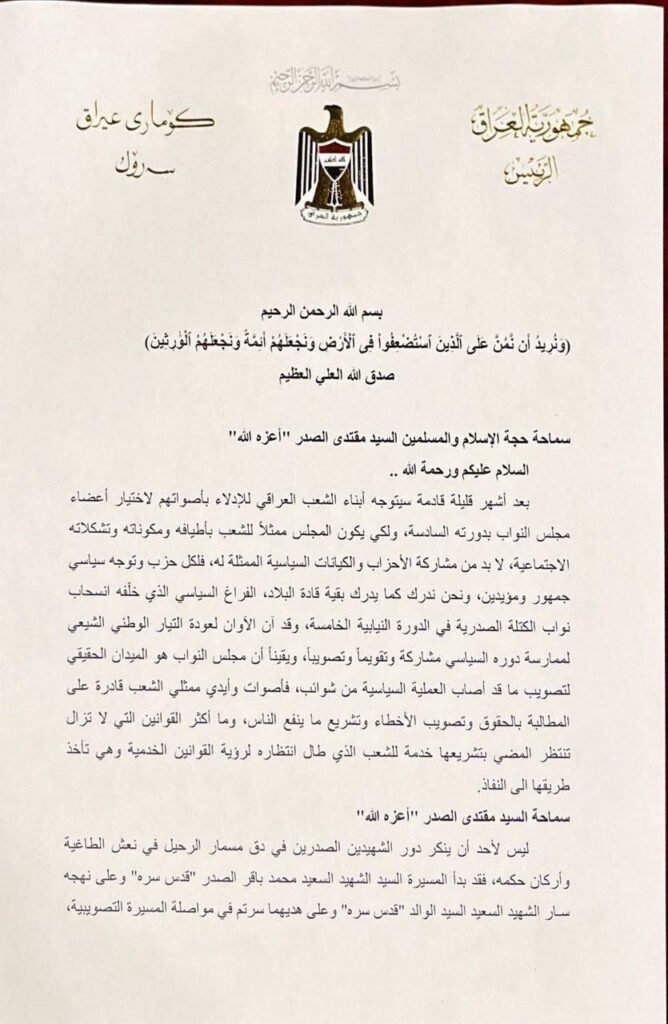 ادناه نص رسالة رئيس الجمهورية الى السيد الصدر: