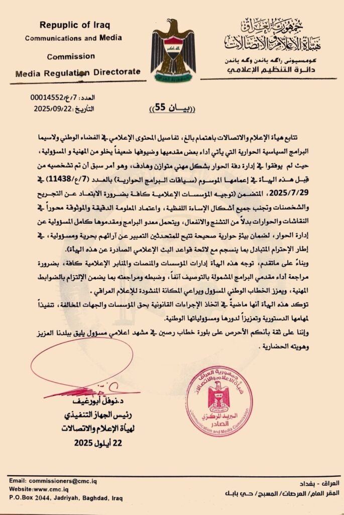 وشدد رئيس الهيأة د.نوفل أبورغيف في بيان رسمي على أهمية أن يتسم الخطاب الإعلامي بالتوازن والدقة والمهنية، بنحو يعزز دور الإعلام العراقي بوصفه رافداً وطنياً لتكريس القيم الدستورية والمسؤوليات المجتمعية، منوهاً بأن هذا التوجيه يأتي في سياق الأمر (7/ت/11438) الصادر بتاريخ 29 تموز 2025 (كما ينص البيان).